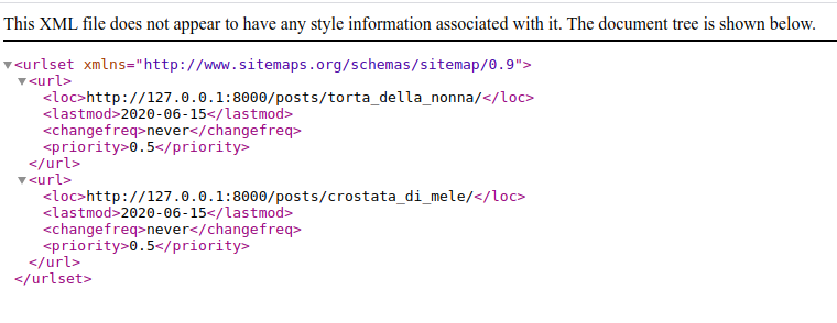 Possiamo quindi andare ad avviare il server di sviluppo e visitare la pagina http://127.0.0.1:8000/sitemap.xml per vedere il risultato.